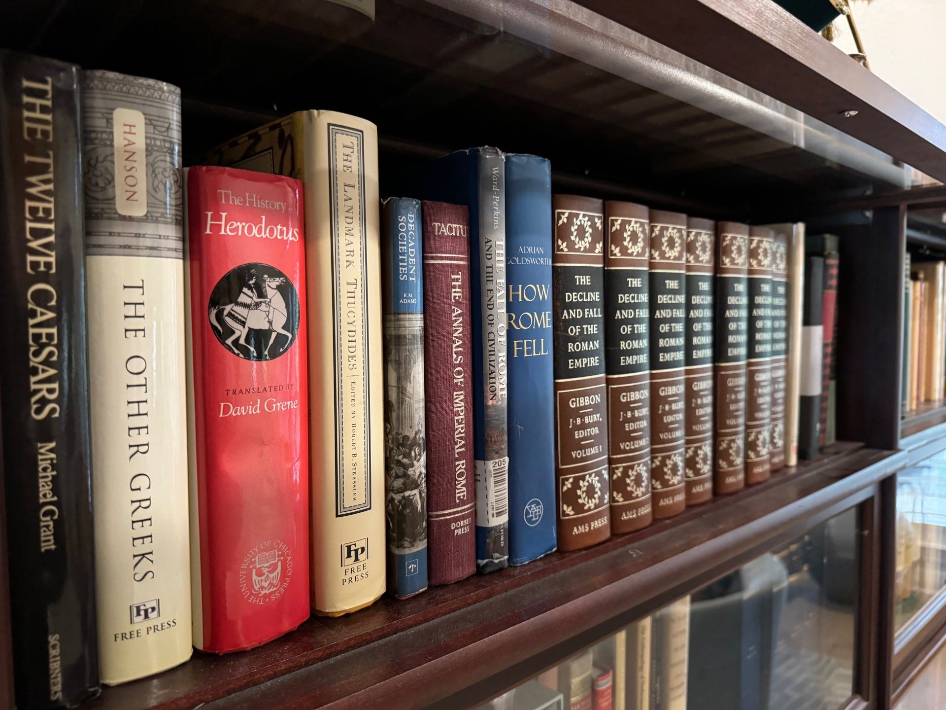 The display included all seven volumes of Edward Gibbon’s 18th-century opus, The Decline and Fall of the Roman Empire ; both volumes of Oswald Spengler’s World War I–era tract, The Decline of the West ; and a 2,500-year-old account of the Peloponnesian War by Thucydides, who “was the first historian to look at his own culture, Greece, and say, I’m going to tell you the story of how stupid we were,” Gioia explained.
