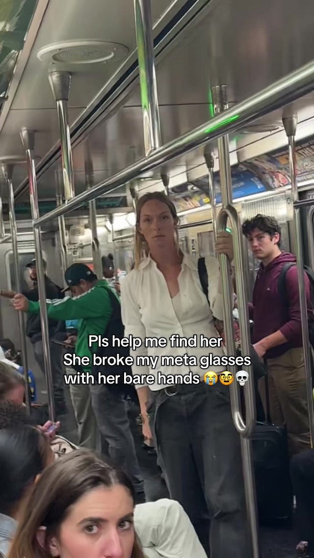 A woman on the subway wasn’t impressed. She stepped up to this tech-loving bro, and grabbed his glasses. Then she broke them in two with her bare hands.