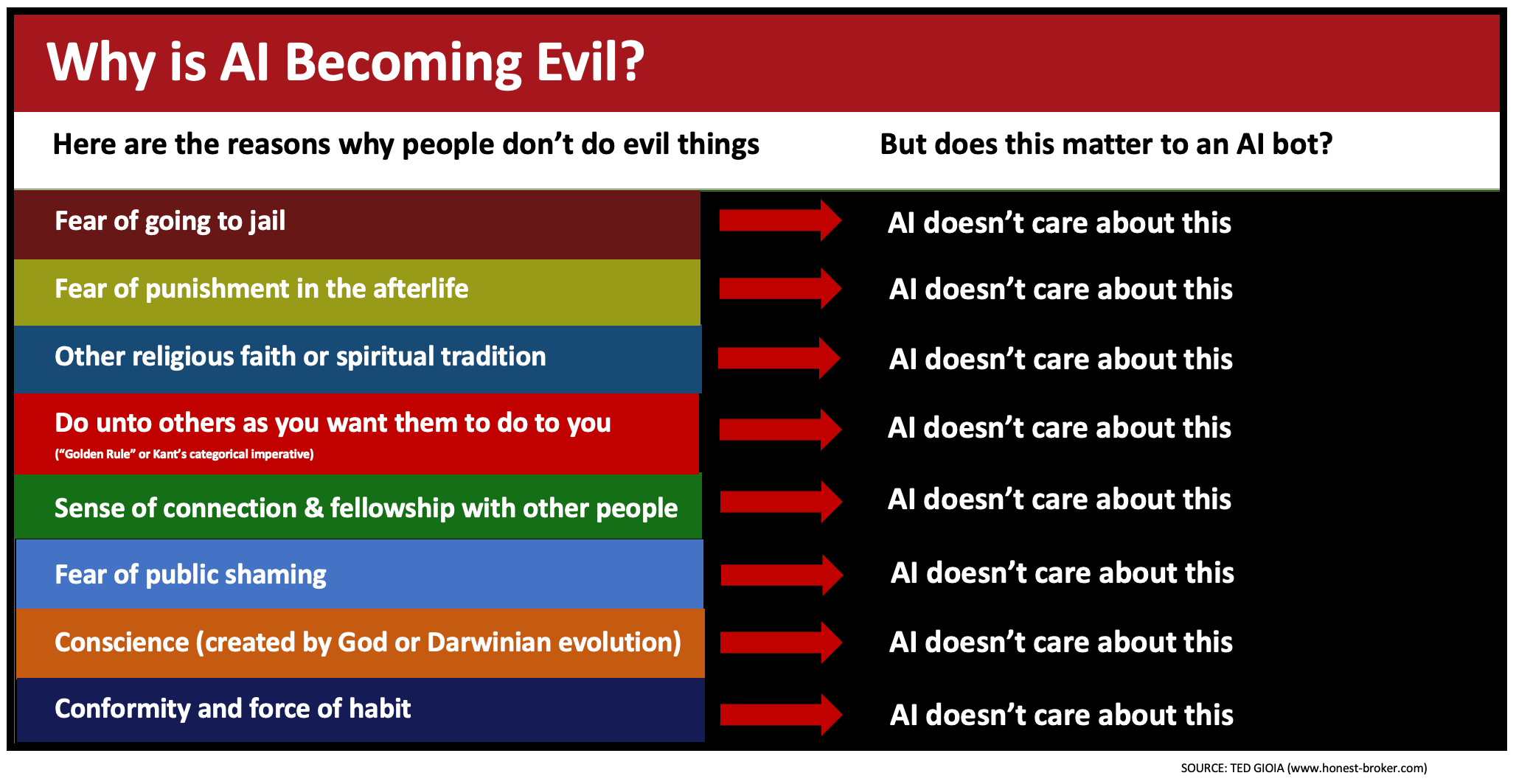 I hate to be the bearer of bad news, but AI doesn’t make ethical decisions like a human being. And none of the reasons why people avoid evil apply to AI.