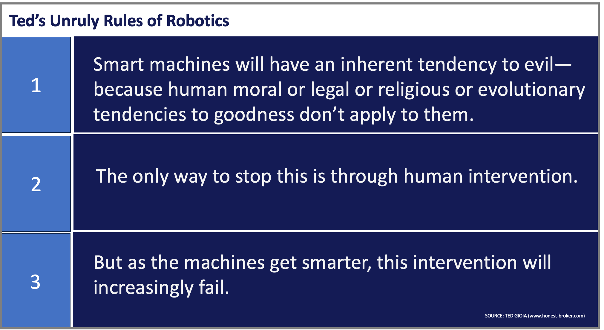 Smart machines will have an inherent tendency to evil—because human moral or legal or religious or evolutionary tendencies to goodness don’t apply to them.