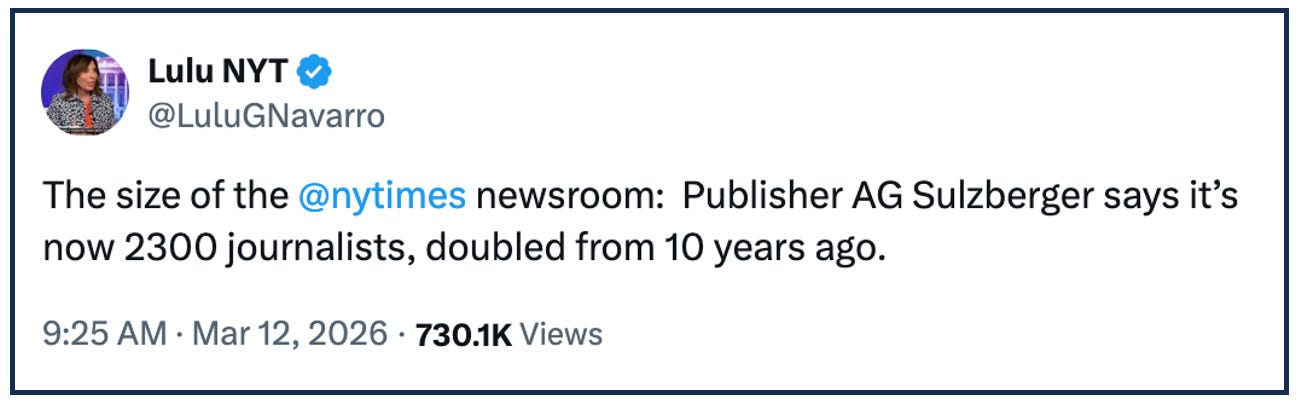Times publisher AG Sulzberger bragged that the newspaper now employs 2,300 journalists—twice as many as a decade ago.