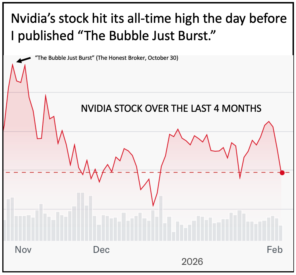 And, finally, on October 30, I announced “The Bubble Just Burst.” We now know that Nvidia reached its all-time high the day before. Its stock has also taken a huge hit since then.