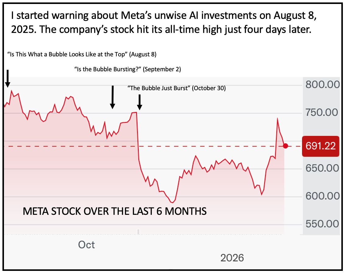 On August 8, I asked “Is This is What a Bubble Looks Like at the Top?” Four days later, Meta stock hit its all-time high, and has fallen sharply since then—despite releasing strong earnings.