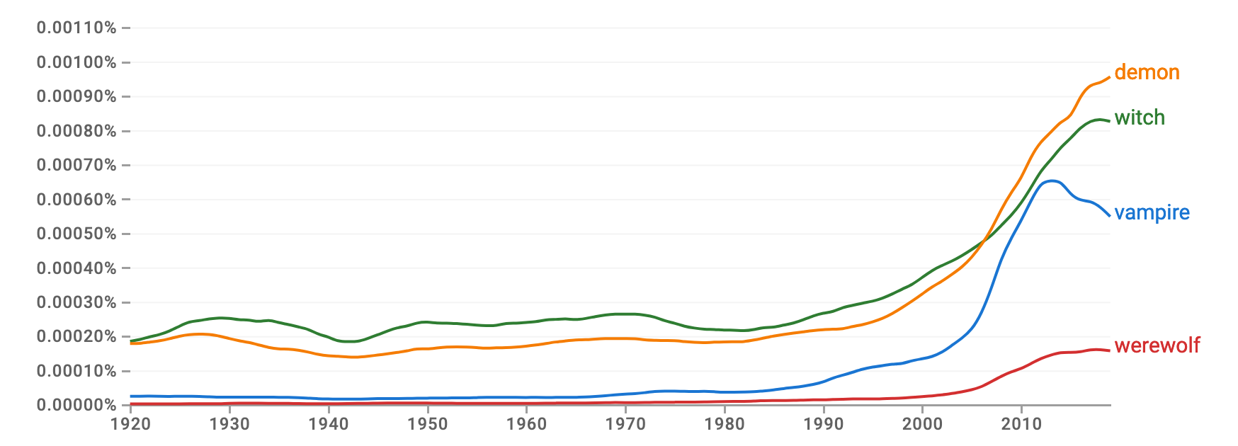 It’s not just movie franchises—the same thing is happening with books. We live in an era of rationalism and science, but that’s not what people want to read about. This chart shows the increasing use of some supernatural words over the last century.