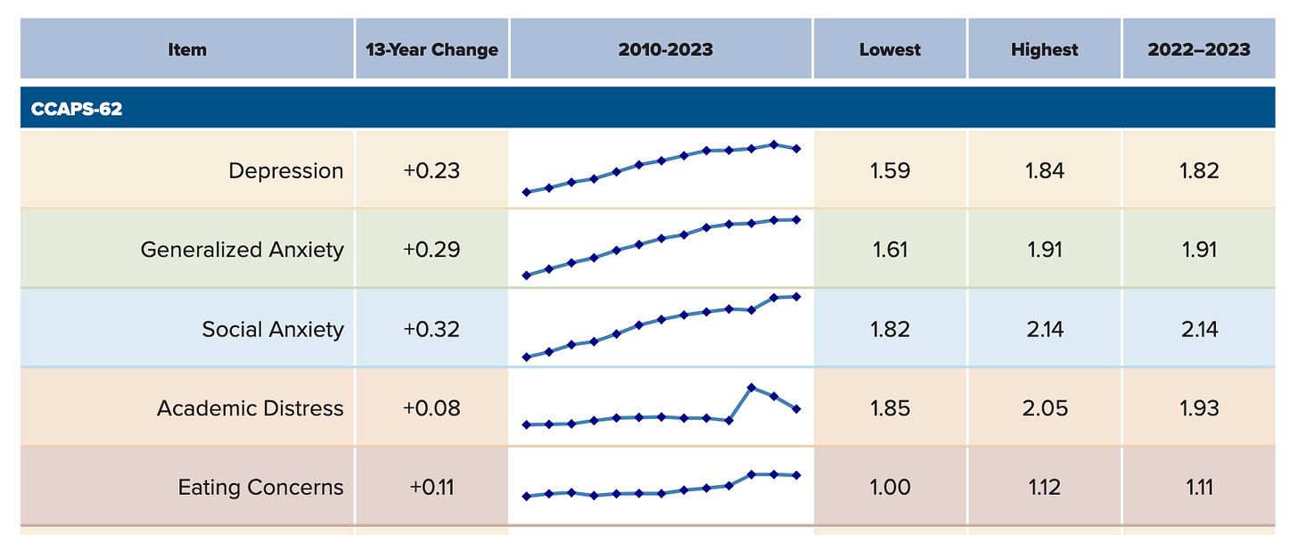 Below are metrics on the mental health of college students. Note that they worry less about grades, but more about everything else.