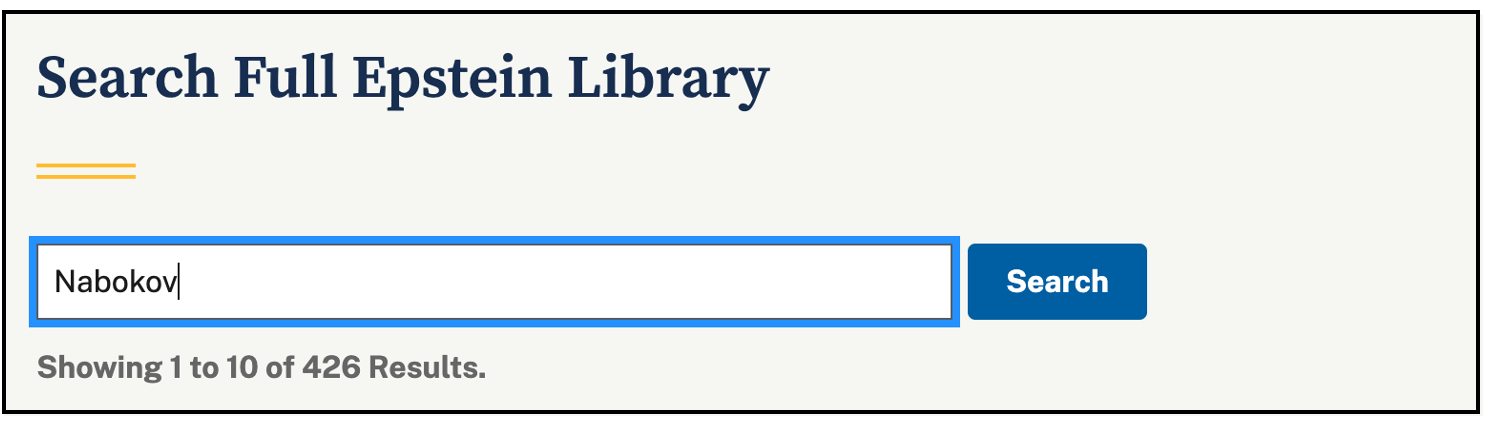 In all fairness, some literary names Epstein gets right. There are 426 references to Vladimir Nabokov (author of Lolita) in the Epstein files. I’ll let you speculate on why that is.