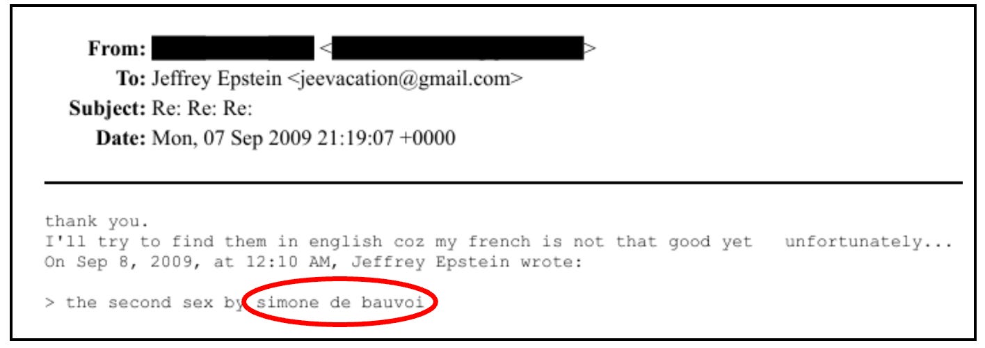Epstein acted the part. He gave out book recommendations and literary advice, but in the clumsiest way. He refers to Simone de Beauvoir in one email as “simone de bauvoi,” and in another instance as “simone de beauoirs.”