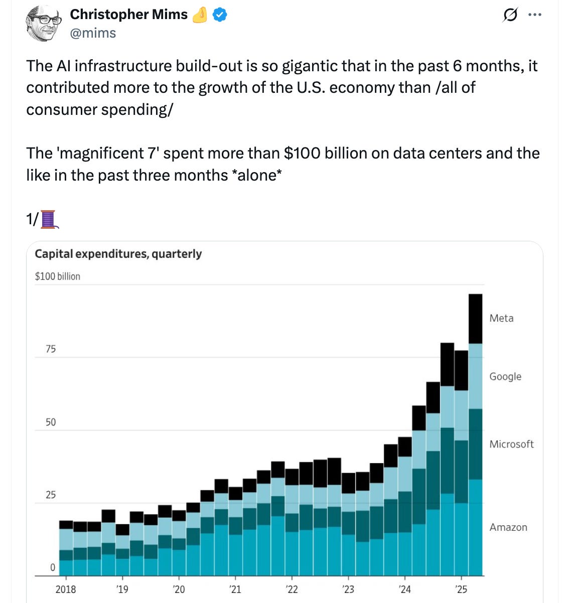 AI buildout is contributing more to measured economic growth than all of consumer spending.