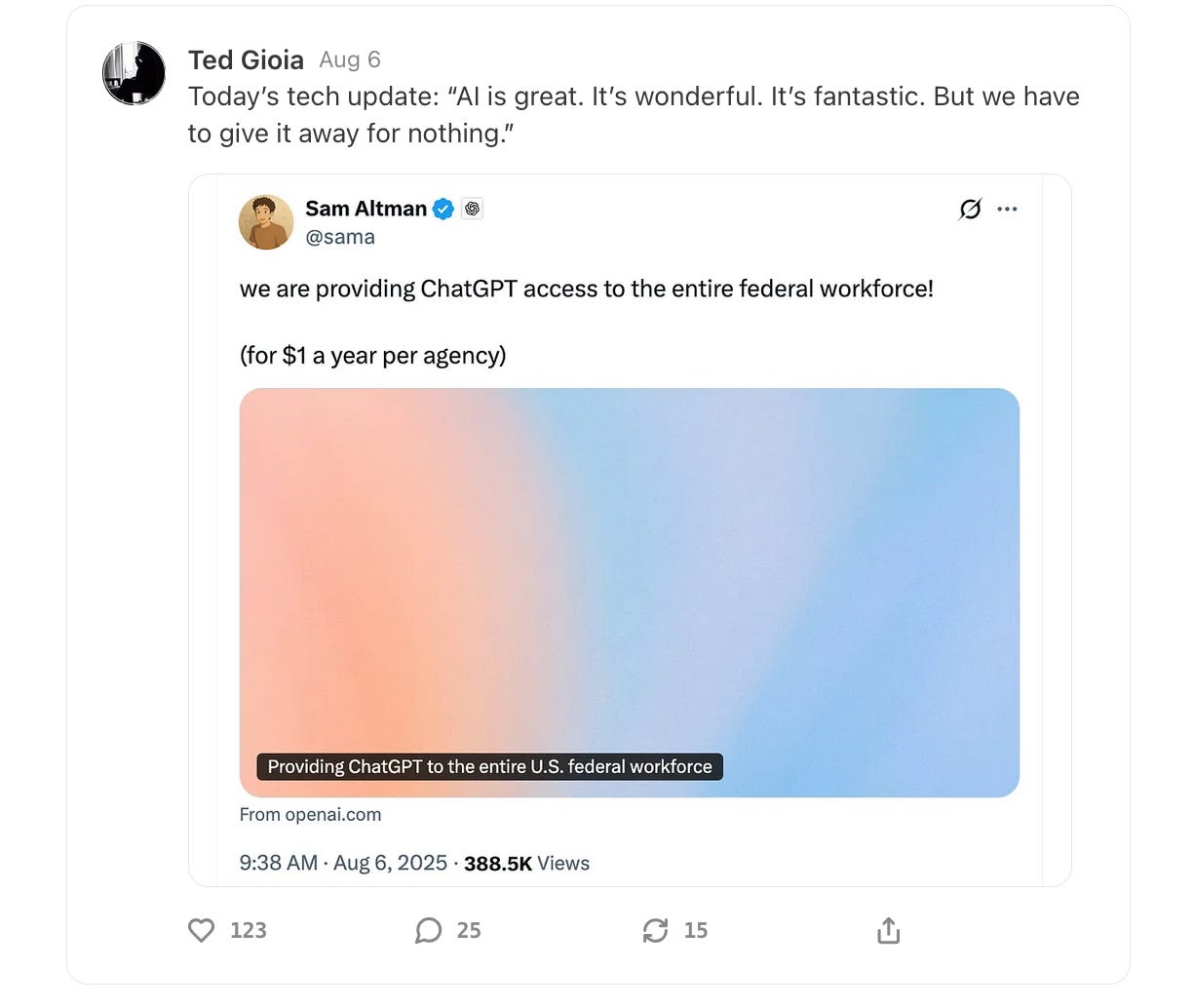 So everywhere I go online, companies are touting free AI. That’s funny. It doesn’t fit the narrative of a transformative technology.