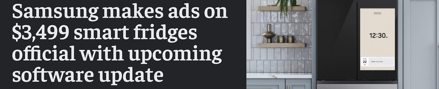 But the most annoying move of all is coming from Samsung. They are putting ads on $3,499 smart fridges. They’re rolling out this “software upgrade” right now.