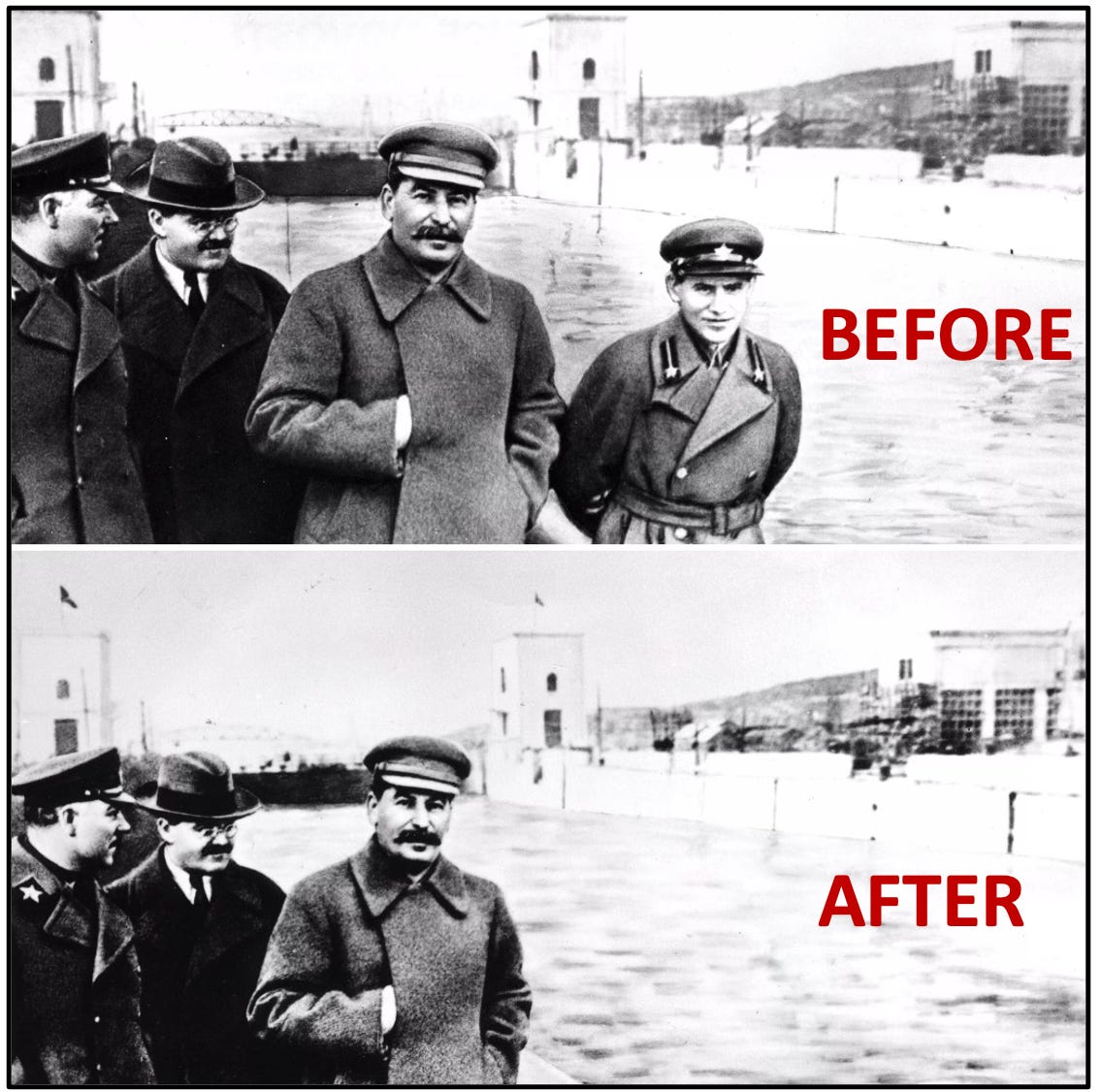 In a famous case, Nikolai Yezhov got removed from his position next to Stalin in a photo taken by the Moscow Canal. This erasure alarmed many party elites because Yezhov, head of the secret police, had been one of the most feared men in the Soviet Union.