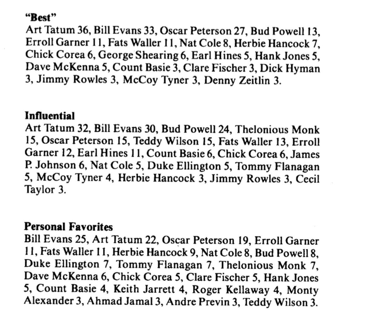 In 1985, critic Gene Lees shared the results of a survey of jazz musicians—who voted on (1) the best jazz pianist, (2) the most influential, and (3) their personal favorite. Voters included Dizzy Gillespie, Dave Brubeck, Marian McPartland, Billy Taylor, and other jazz luminaries. Here are the results.