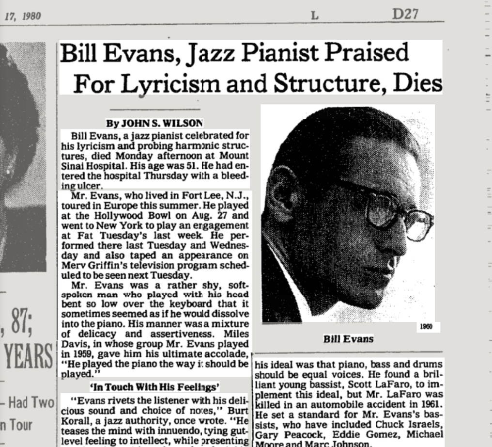 “Bill Evans, a jazz pianist celebrated for his lyricism and probing harmonic structures, died Monday afternoon at Mount Sinai Hospital. His age was 51.”
