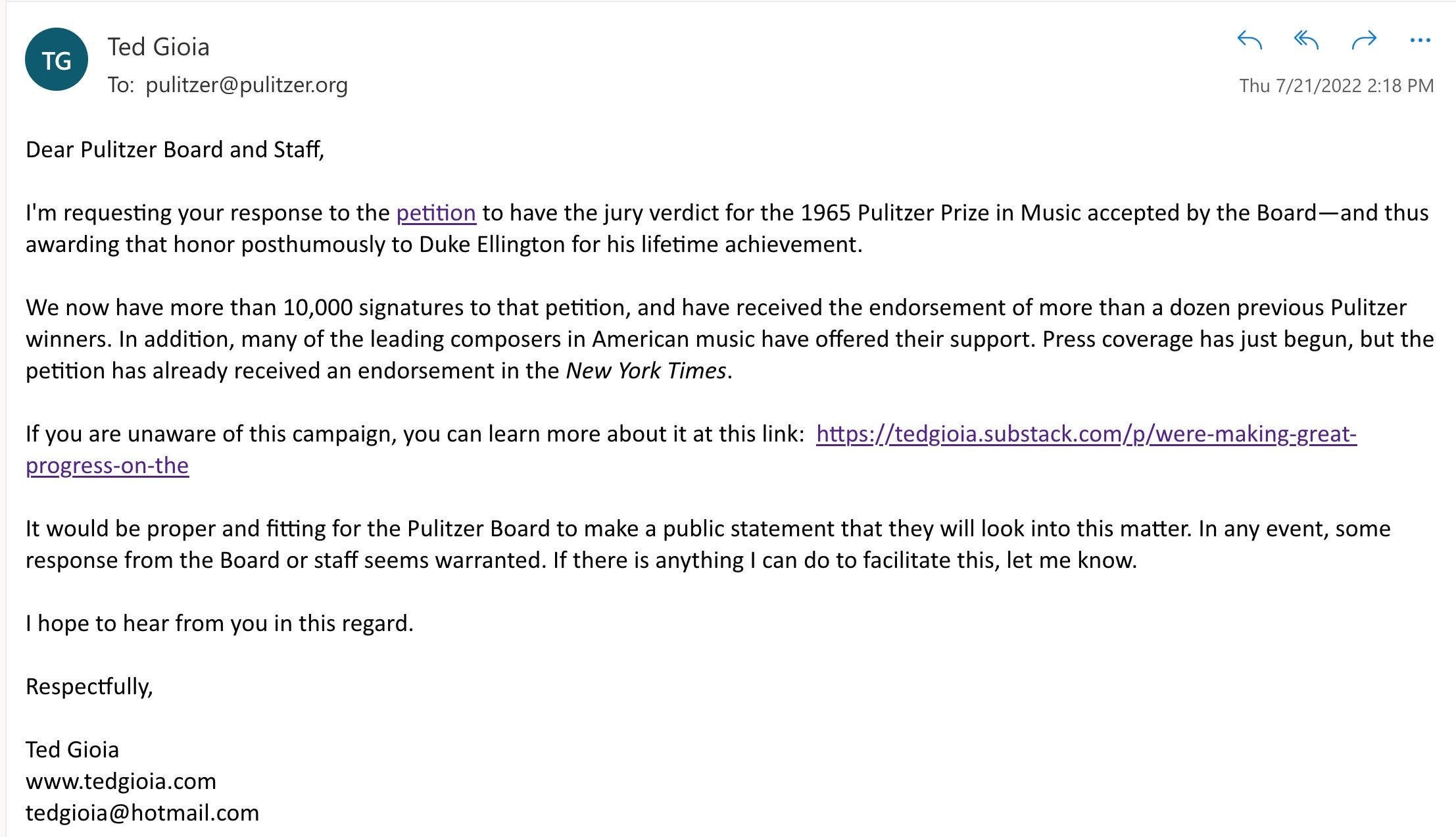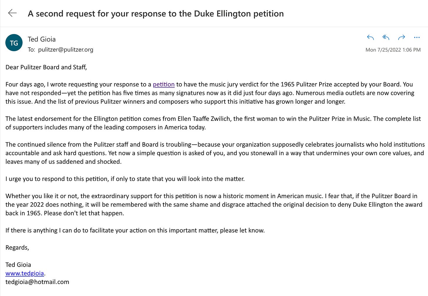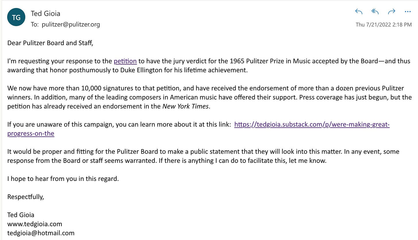I want to thank all of you who signed the petition to get Duke Ellington the Pulitzer Prize he was denied back in 1965. We’ve made extraordinary progress in just a few days.
