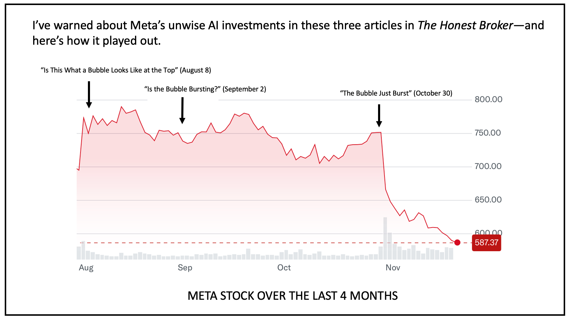 I recently published three very controversial articles here—warning readers about the growing backlash against AI. I called special attention to the vulnerability of Meta’s stock.