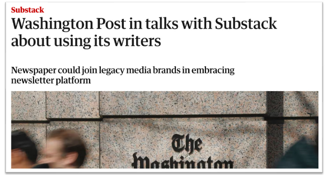 The Washington Post has held talks with Substack about hosting pieces by its writers…..Substack’s Hamish McKenzie said he had spoken to the Post about its plans to widen the types of opinion pieces on its website.