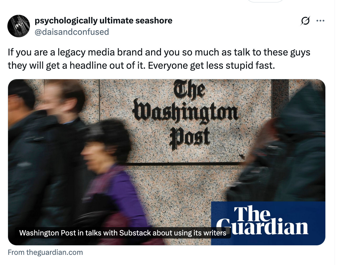 Legacy media outlets can already hire writers from this platform by approaching them directly—I get asked all the time. They don’t need permission. So I give the Post credit for trying to establish a formal partnership instead of just poaching talent.