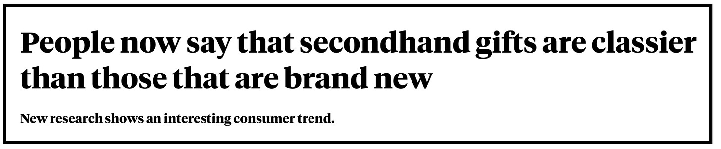 The Wall Street Journal noticed it a few weeks ago. People are now buying secondhand gifts. The sheer numbers are staggering—in a recent survey, 82% of consumers said they’re more likely to purchase pre-owned items for holiday presents.