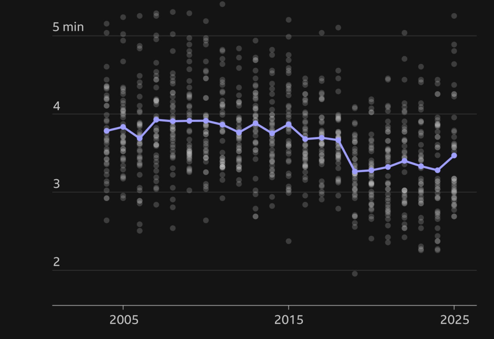 We’re still several steps away from new pop epics as long as “Hey Jude" (7 minutes 12 seconds) and “Bohemian Rhapsody” (5 minutes 55 seconds). But we’re trending in that direction. I wouldn’t be surprised if a new breakout hit surprises everyone with its length.
